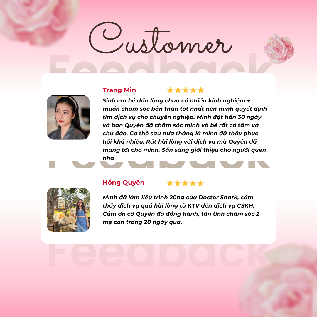 🌷 “Cảm ơn cô Hạnh đã mang đến dịch vụ tận tâm chuyên nghiệp, mẹ được trải nghiệm chăm sóc sau sinh đầy đủ các bước nên rất nhanh chóng hồi phục, bé được cô tắm, vận động nên trộm vía ăn ngon , ngủ ngon . Dịch vụ rất tốt và mẹ rất yên tâm khi lựa chọn Doctor shark 🥰”